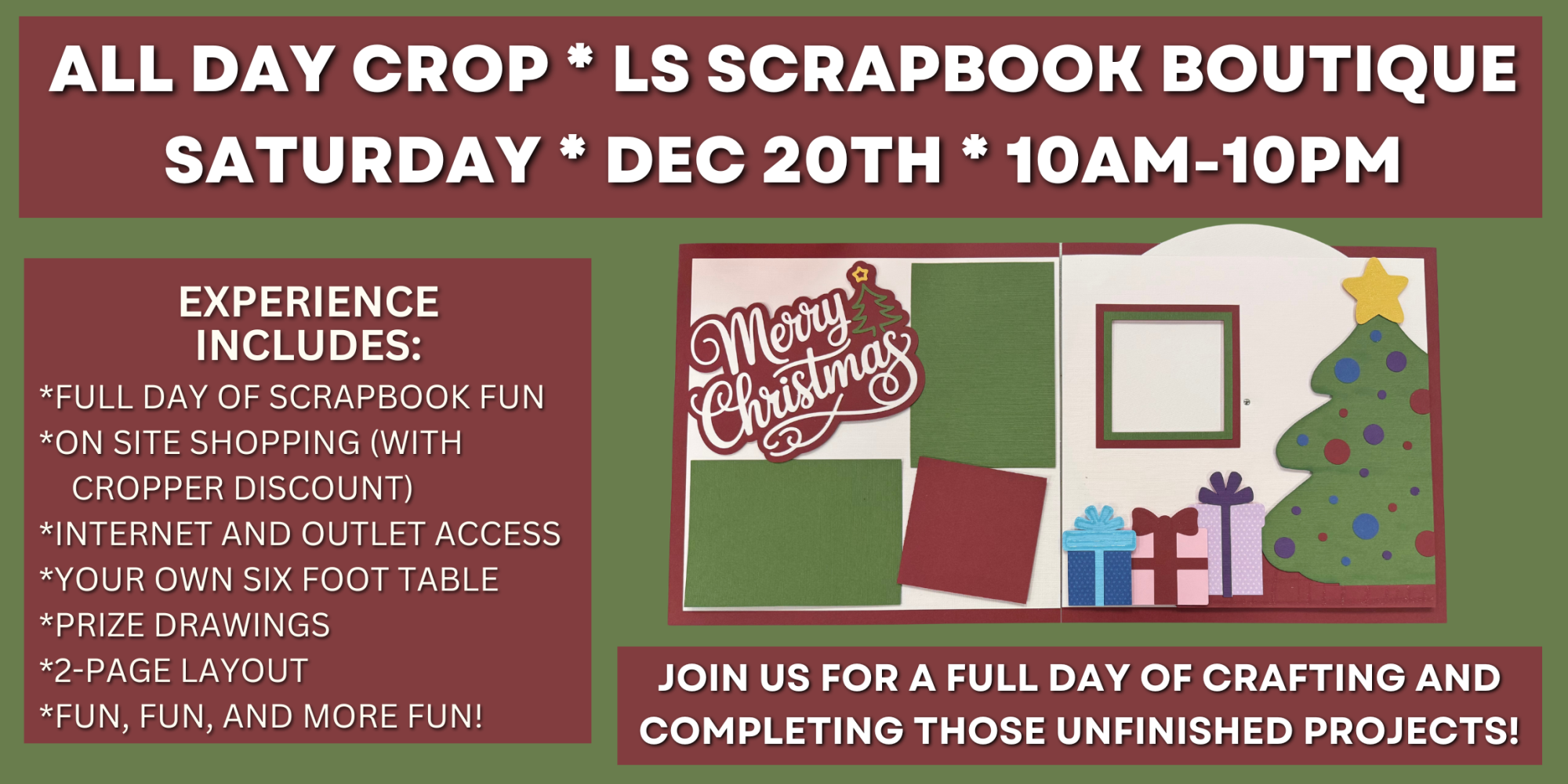 | Requirements: | Bring whatever supplies you need to complete your unfinished projects. |